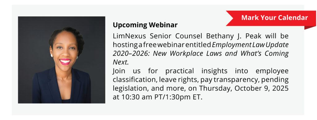 We’ll be discussing this case and many other recent employment law developments at the upcoming free webinar presented by LimNexus Senior Counsel, Bethany J. Peak: Employment Law Update 2020–2026: New Workplace Laws and What’s Coming Next.